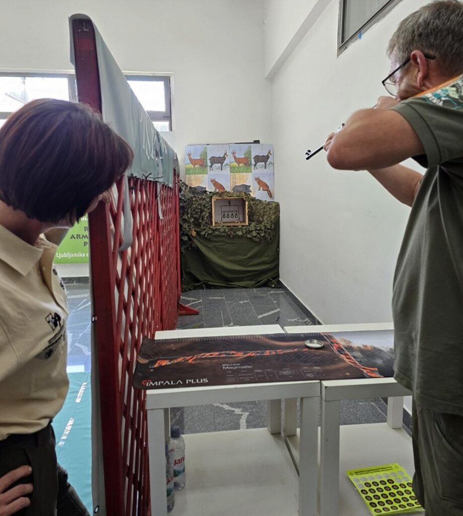 Predsednik Komisije za lovsko strelstvo in lovsko orožje Matija Janc je v dogovoru z nami poleg naše stojnice postavil zavarovano strelišče, na katerem so se udeleženci lahko preizkusili v streljanju z zračno puško in si od zadetih vsaj treh od petih tarč prislužili srečko. Srečelov je tako postal za udeležence zelo zanimiv, naš predstavitveni prostor pa zelo obiskan.