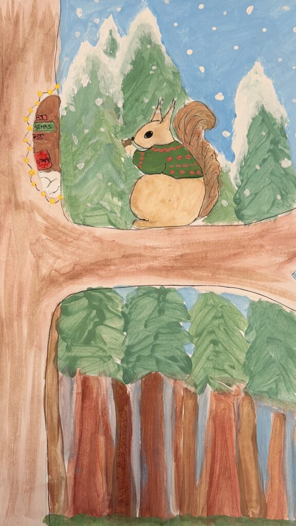 - mesto je osvojila Neža Perše (OŠ Kanal) z likovnim delom “Veverica v zimski pravljici”