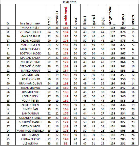 - 1. mesto: Miha Finkšt (380 točk) – Trenutno vodilni, ki je svojo prednost zgradil na vrhunskem streljanju na golobe (188 točk) in izjemni stabilnosti pri krogli.