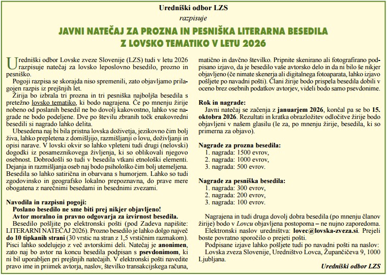 Uredniški odbor Lovske zveze Slovenije je tudi v letu 2026 razpisal javni natečaj za prozna in pesniška literarna besedila z lovsko tematiko, ki je objavljen v januarski številki Lovca. Vabljeni k sodelovanju!