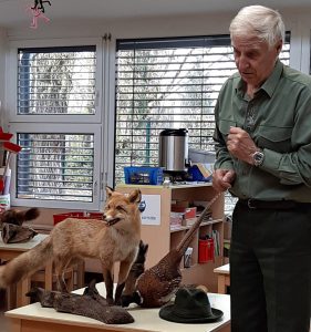 Predstavil nam je lovstvo kot naravovarstveno dejavnost, s katero lovci skrbijo za ravnovesje v naravi. Opisal je živali, ki živijo v naših gozdovih in na travnikih, povedal, da ima pasjega pomočnika Tara, nam zaupal nekaj svojih lovskih doživetij, pokazal nekaj nagačenih živali, povedal, kako sodelujejo s kmeti … Ura z njim je prehitro minila, zato smo jo nadaljevali z igro kart in spomina, ki nam jih je v sodelovanju z Lovsko zvezo Slovenije tudi podaril.