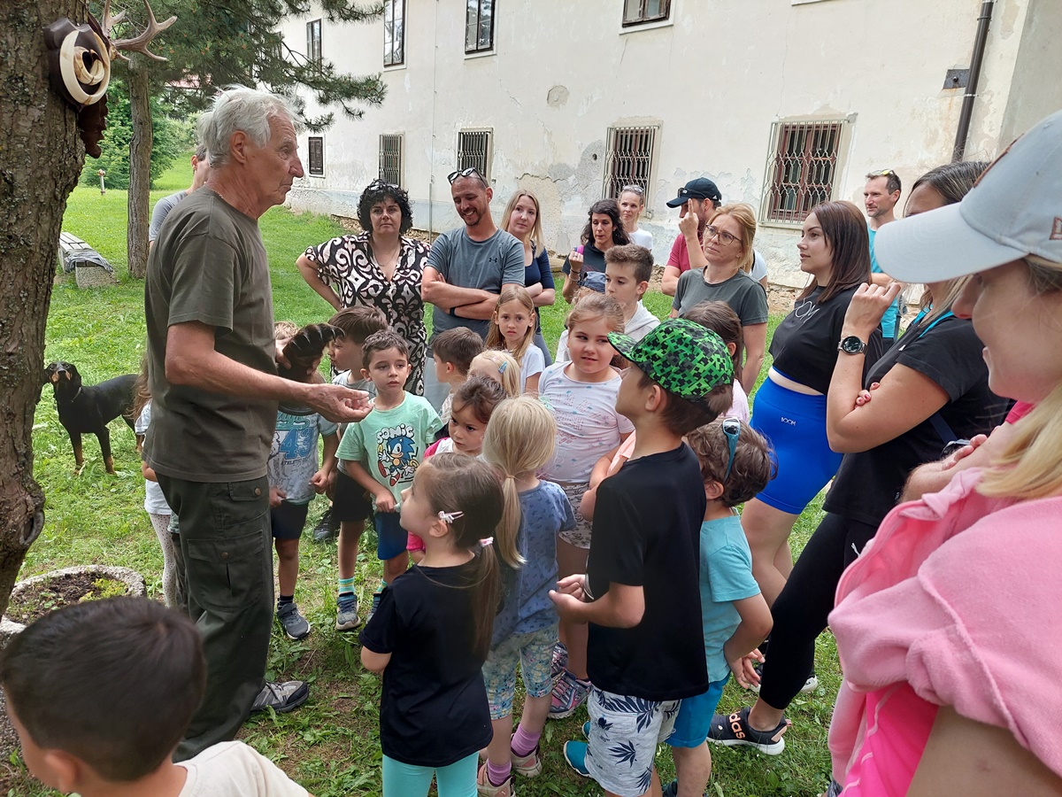 Marsikateremu otroku je sprehod polepšala psička Arja. Na cilju sta nam lovca organizirala še eno presenečenje … Mislim, da smo tu uživali prav vsi. Otroci in starši! Z radovednostjo in veseljem smo poslušali lovca Boruta, ki nam je o vsaki razstavljeni živali (preparatu) povedal svojo zgodbo. Res je bilo čudovito. Poslušali smo s takim zanimanjem, da smo pozabili na lakoto in pico, ki nas je čakala na mizah.
