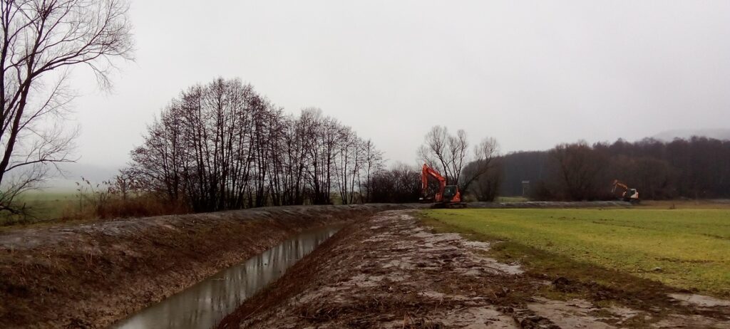 Kljub zimi se čiščenje vodotokov v osrednjih Slovenskih goricah nadaljuje. Pred dnevi so zabrneli stroji pod kmetijo Rojs v Brengovi in začeli na veliko čistiti in urejati prvega od dveh melioracijskih jarkov Drvanje.