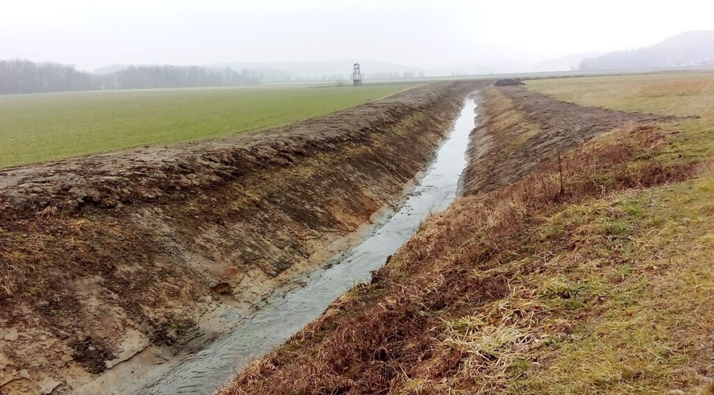 Čagonsko polje s povsem očiščenim melioracijskim jarkom, ob katerem vsaj nekaj časa ne bo prostora za prostoživeče živali. Foto: Marjan Toš